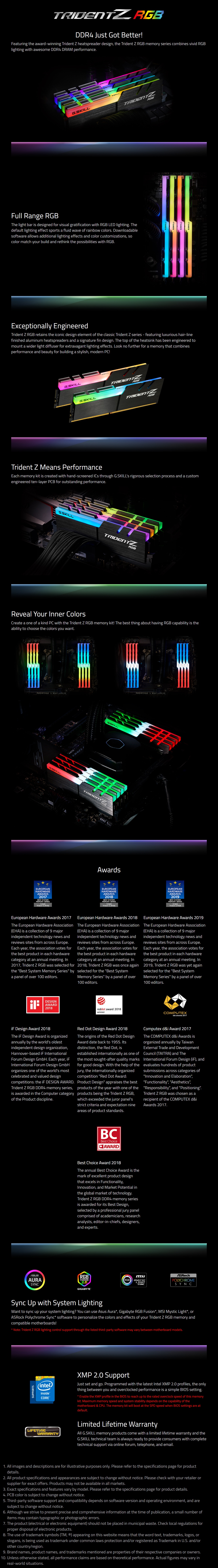 Additional Notes | Do not mix memory kits. Memory kits are sold in matched kits that are designed to run together as a set. Mixing memory kits will result in stability issues or system failure. Prior to enabling XMP, memory kits will boot at default BIOS settings with compatible hardware. For memory kits with XMP, enable XMP/DOCP/A-XMP profile in BIOS to reach the rated potential XMP overclock speed of the memory kit, subject to the use of compatible hardware. Please refer to the “How to Enable XMP/EXPO” guide. Reaching the rated XMP overclock speed and system stability will depend on the compatibility and capability of the motherboard and CPU used. Usage in any manner inconsistent with manufacturer specifications, warnings, designs, or recommendations will result in lower speeds, system instability, or damage to the system or its components. Memory module height can be found in the FAQ, under the question “How tall are the memory modules?”. For product support and related questions, please contact the G.SKILL technical support team via email. |